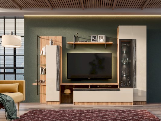 • Модуль скомбинирован из шкафа с открытыми и закрытыми полками, тумбы и полки под ТВ