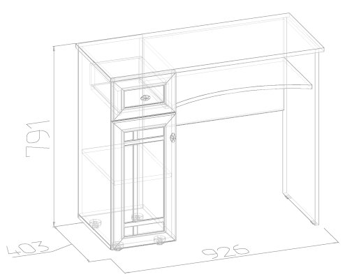 Туалетный столик с тумбой и выдвижным ящиком - самый удобный, вместительный и при этом скромный по габаритам вариант. Небольшой ящик на шариковых направляющих полного выдвижения. Они обеспечивают максимальный доступ к содержимому ящика и плавность его хода. За рамочным фасадом просторная ниша с полкой, регулируемой по высоте. Полка под столешницей с фигурным вырезом позволит комфортно сидеть за столиком человеку высокого роста. Сам по себе туалетный стол соответствует по высоте нормам ГОСТ и может использоваться как письменный или для работы с ноутбуком. Зеркало докупается отдельно, можно выбрать любое из имеющихся в коллекции Sherlock вариантов.