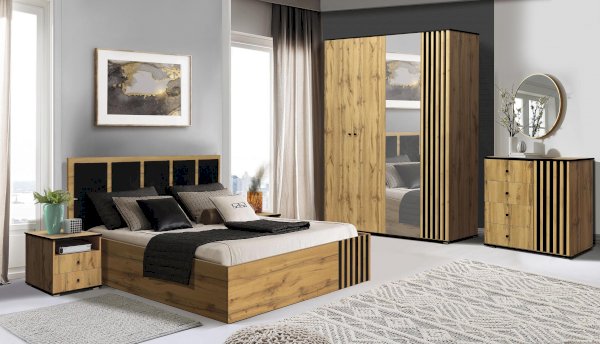Дизайн кровати заслуживает особого внимания. Пять вставок из черного велюра нанесены на изголовье кровати. Это смотрится гораздо более стильно, чем сплошное изголовье. К тому же удачно перекликается с визитной карточкой коллекции – комбинацией фасадной рейки. Принцип тот же – на фоне теплого дерева (основа МДФ) контрастно выделяются черные вертикальные вставки. На изголовье – из мягкого велюра, на изножье – из реек в пленке ПВХ. Контраст усиливается размером и фактурой вставок. Велюровые – мягкие и широкие, реечные – твердые, тонкие и изящные. Накладки делают элементы объемными, что придает особый шарм. Высокое изголовье и низкое изножье – удобно и практично. На мягкое изголовье можно опереться, как на диванную подушку, а у низкого изножья нет ограничений по длине.