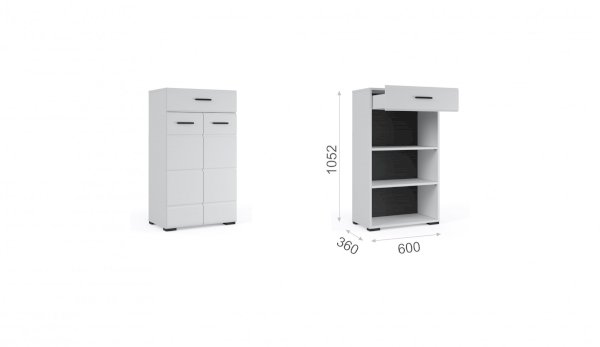 Комод Йорк сочетает в себе практичность и эффектный внешний вид. Глянцевые белые фасады High Gloss из МДФ наполняют помещение светом, делают его воздушнее. Тумба оснащена выдвижным ящиком на телескопических направляющих полного выдвижения для хранения необходимых мелочей. Отделение с распашными дверями укомплектовано вместительными полками для коробок с обувью или сумок. Идеально компонуется со всеми модулями системы Йорк.