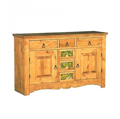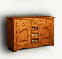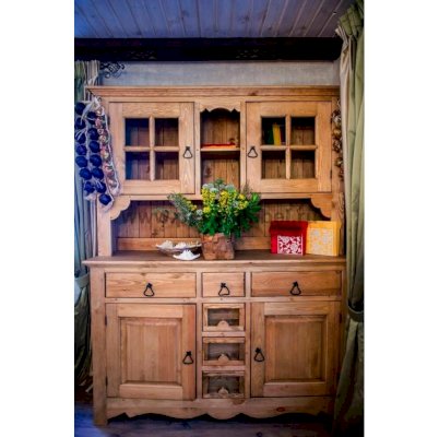 Буфет из массива сосны ENSEMBLE 150. Широкий буфет оценят и любители оригинальных интерьеров, и практичные хозяева. Комплект из нижней тумбы и верхнего буфета выполнен в стиле Прованс. За стеклянными дверцами можно хранить праздничные сервизы, семейные раритеты, интерьерные вещицы.  Задние стенки всех буфетов набраны из дощечек массива сосны. Также из массива сосны набраны днища ящиков. В конструкции нет элементов из фанеры, ДСП, или МДФ.