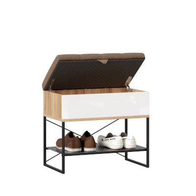 - Банкетка установлена на опорный металлический каркас со стационарной металлической полкой для обуви (полка с перфорацией)