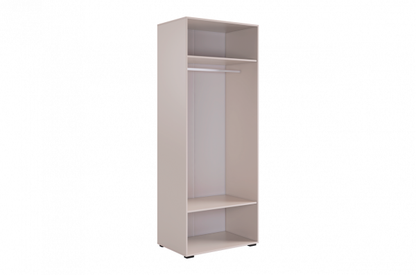 Шкаф оснащён длинными пластиковыми ручками и имеет удобное внутреннее наполнение: две большие полки и одна длинная штанга. Это позволяет рационально использовать пространство и разместить различные типы одежды.