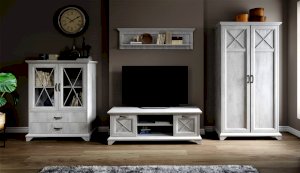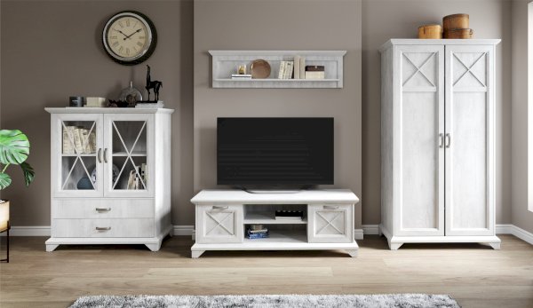 Распашной двухдверный шкаф выполнен в популярном стиле неоклассика – белые рамочные фасады с фактурой и рисунком натурального дерева, декоративные крестообразные накладки, фигурные ножки и карниз все это придает комнате элегантный и светлый вид. Вместительное отделение с полками поместит в себя одежду, коробки с обувью и головные уборы. Мебель выполнена из экологичных материалов.