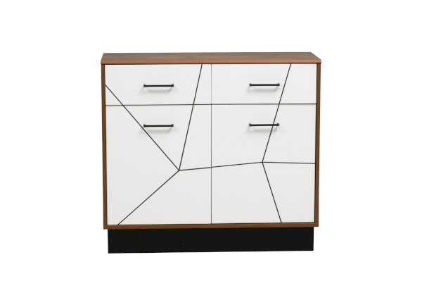 Комод имеет небольшие размеры, но в него помещается все, что нужно. Два выдвижных ящика сверху – для бумаг, счетов, документов, либо для нижнего белья (если комод стоит в спальне). Ящики снабжены шариковыми направляющими, которые обеспечивают плавный ход выдвижения. Под выдвижными ящиками находятся два отсека с полками из ЛДСП – в каждом по две. Полки разного размера – верхние чуть поменьше, нижние – более вместительные. Каждая из полок выдерживает вес до 5 кг. Полки закрываются распашными дверцами.