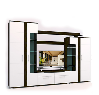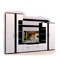 Стенка «Барселона» выполнена в стильном современном дизайне, прекрасно сочетающем в себе контрастность цвета, ассиметричное исполнение, стеклянные витринные модули и элементы подсветки. Фасады МДФ