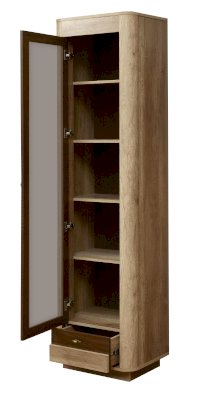 Высокий и изящный шкаф-витрина отлично впишется в интерьер гостиной или столовой. Он неслучайно называется витрина, потому что его главная задача – продемонстрировать свой внутренний мир. Фасад представляет собой рамочную конструкцию со стеклом. Внутри – пять одинаковых по высоте полок из ЛДСП, каждая из которых выдерживает вес до 5 кг. Здесь будет хорошо смотреться посуда. Если поставить такой шкаф в кабинет или детскую комнату, в него поместится небольшая библиотека.