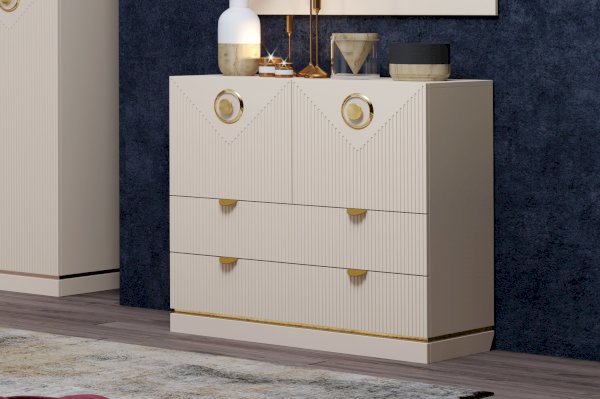 Конструкция комода включает два широких ящика, а также два закрытых отделения с дверками. Украсить интерьер можно разместив на столешнице комода декоративные предметы, вазы или любимые фотографии.