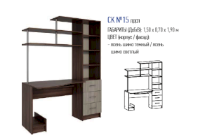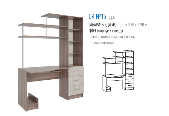 Стол компьютерный №15 — это функциональная мебель для организации на дому комфортного места для работы за ПК. Конструкция состоит множества полезных элементов: специальных полочек для клавиатуры и процессора, выдвижных ящиков, стеллажных и навесных полок для хранения бумаг, канцелярских принадлежностей и других нужных вещей. Изогнутая форма столешницы позволяет сидеть в максимально удобном положении.