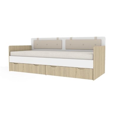 - комплектом подушек (размеры ширина (длина) 750 мм, глубина 40 мм, высота 250 мм). Подушки на липах крепятся к спинке кровати на двусторонний скотч. Ткань Гудлак 3 (цвет «бежевый», тип ткани «рогожка»)