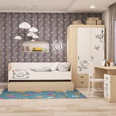 Детская «Кот» - удобная и безопасная мебель для вашего ребенка. Яркий принт на мебели создаст атмосферу в детской комнате. Каждый модуль комплектуется ручками двух цветов, что даст Вам прекрасную возможность, выбрать более подходящий цвет для вашего интерьера.