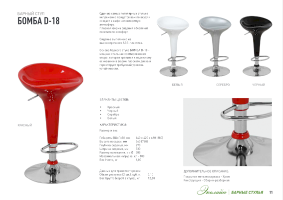 Самый полулярный барный стул БОМБА D-18 непременно придется вам по вкусу и создает в кафе неповторимую атмосферу. Основа барного стула БОМБА D-18 - мощная стальная хромированная опора, которая крепится к надежному основанию в форме плоского диска и гарантирует требуемый уровень устойчивости Плавная форма сидения обеспечит посетителю комфорт.