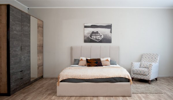 Современная удобная и эргономичная кровать с высоким мягким изголовьем, декорированным вертикальными кантами, создает в спальне комфортную и уютную атмосферу. Практичная мягкая ворсистая поверхность обивки ярких цветов, вызывающая приятные тактильные ощущения, идеально точно повторяет силуэт конструкции кровати, украшает и облагораживает спальню. Вместительный бельевой ящик увеличит полезную площадь спальни и станет дополнительным местом для хранения необходимых вещей.